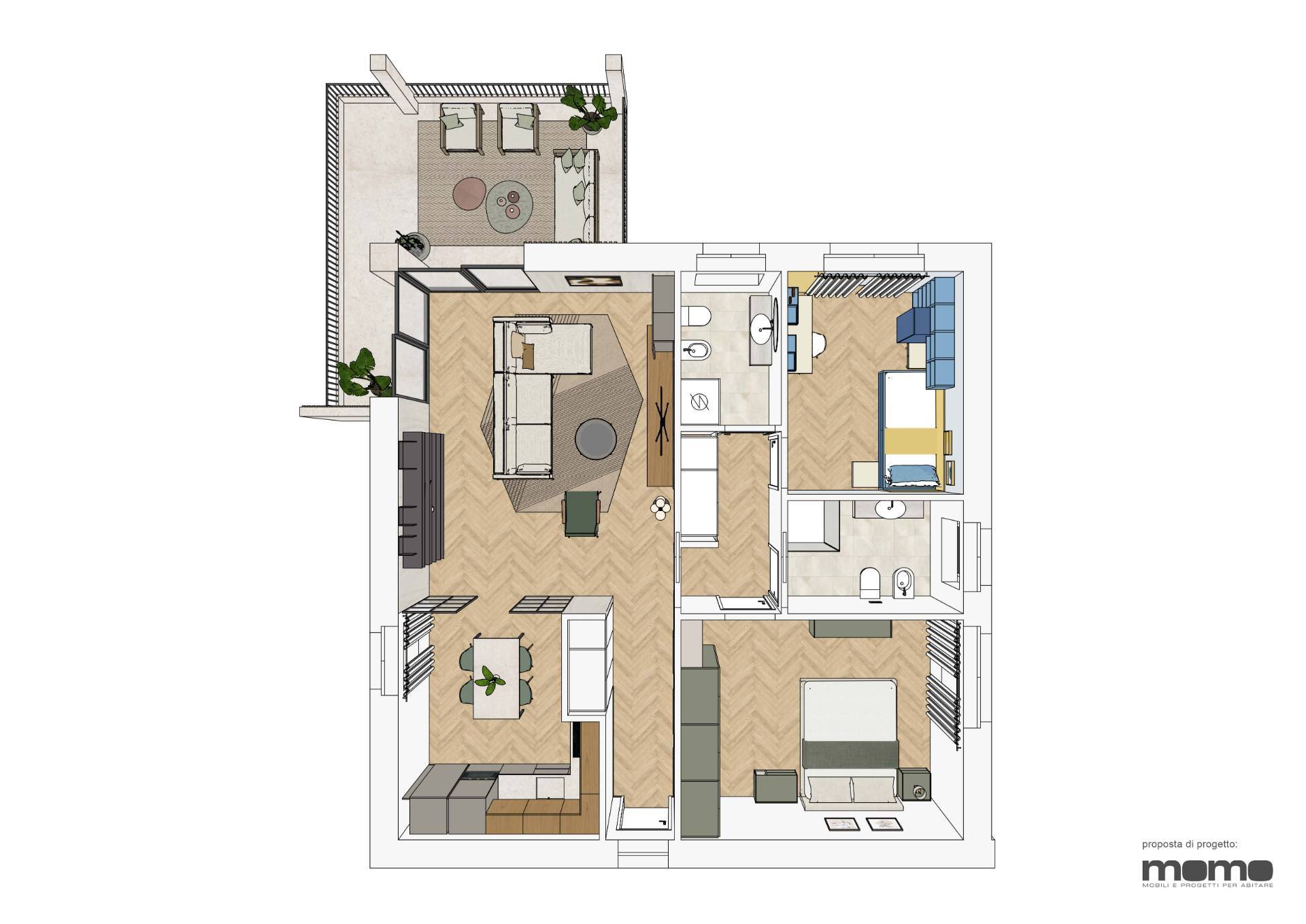 Gli appartamenti presentano una distribuzione interna razionale e moderna, con ingresso living su soggiorno, cucina a vista e un pratico terrazzo di circa 15 mq. La zona notte è composta da una camera matrimoniale, una camera singola e doppi servizi. È prevista inoltre la possibilità di personalizzare gli spazi interni, con l'opportunità di ricavare una terza cameretta riducendo la metratura della zona giorno.